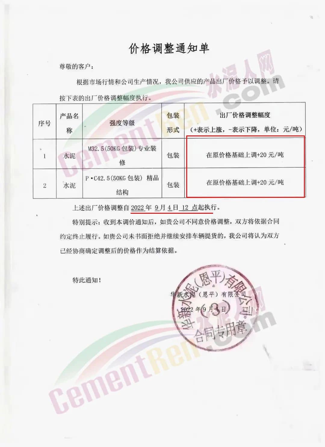 華新水泥(恩平)有限公司通知,自9月4日12點(diǎn)起旗下M32.5包裝專業(yè)裝修、PC42.5包裝精品結(jié)構(gòu)水泥在原價(jià)基礎(chǔ)上上調(diào)20元/噸。