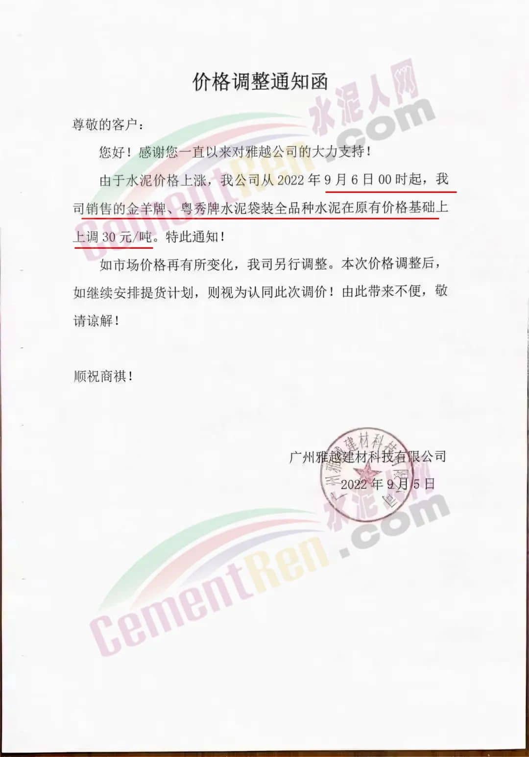 廣州雅越建材科技有限公司通知,由于水泥價(jià)格上漲,公司從9月6日0時(shí)起,公司銷售的金羊牌、粵秀牌水泥袋裝全品種水泥在原價(jià)格基礎(chǔ)上上調(diào)30元/噸。
