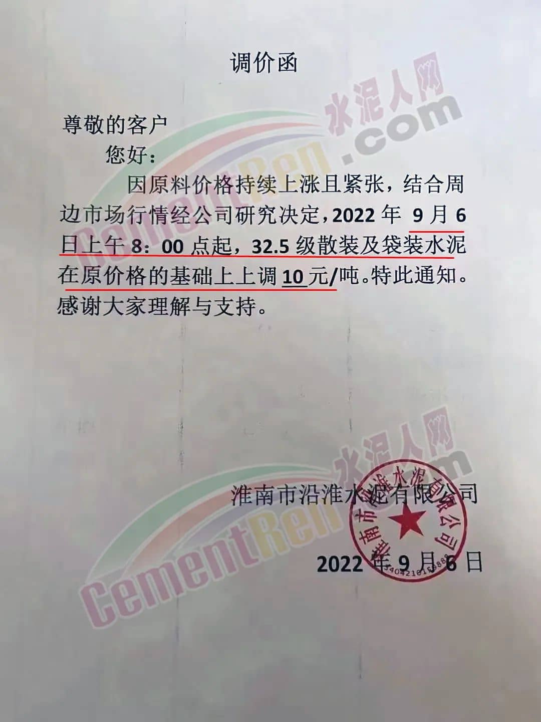 安徽淮南市禹山水泥有限公司、淮南市沿淮水泥有限公司通知,9月6日上午8時(shí)起,32.5袋裝、散裝水泥上調(diào)10元/噸。