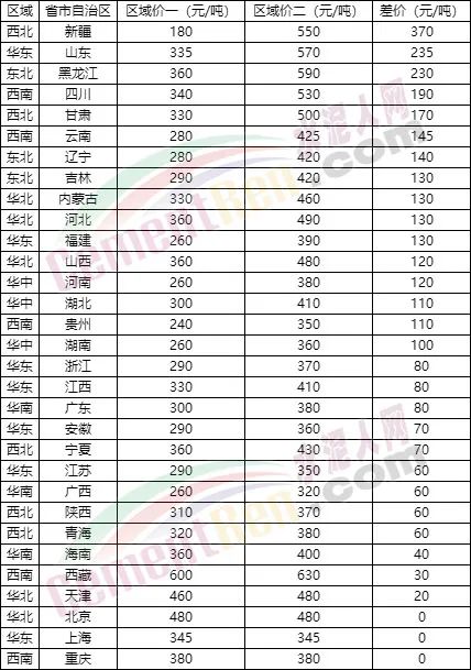 吉林、浙江、安徽、江蘇、云南、遼寧、福建、河南、湖南、廣西、貴州、新疆等12個(gè)地區(qū)區(qū)域一價(jià)格在300元/噸以下;重慶、黑龍江、河北、山西、寧夏、四川、山東、甘肅、內(nèi)蒙古、江西、青海、陜西等28個(gè)省市自治區(qū)均價(jià)在國家統(tǒng)計(jì)局公布的流通領(lǐng)域報(bào)價(jià)384.3元/噸以下。