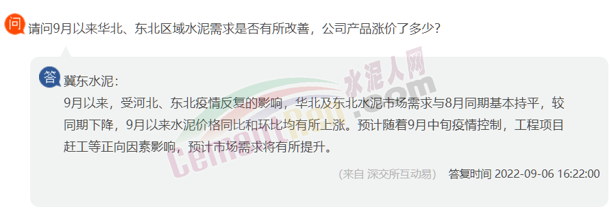 另有投資者提問,9月以來華北、東北區(qū)域水泥需求是否有所改善,公司產(chǎn)品漲價(jià)了多少?冀東水泥回復(fù)稱,9月以來,受河北、東北疫情反復(fù)的影響,華北及東北水泥市場需求與8月同期基本持平,較同期下降,9月以來水泥價(jià)格同比和環(huán)比均有所上漲。