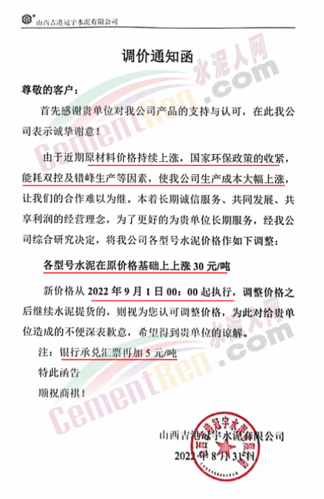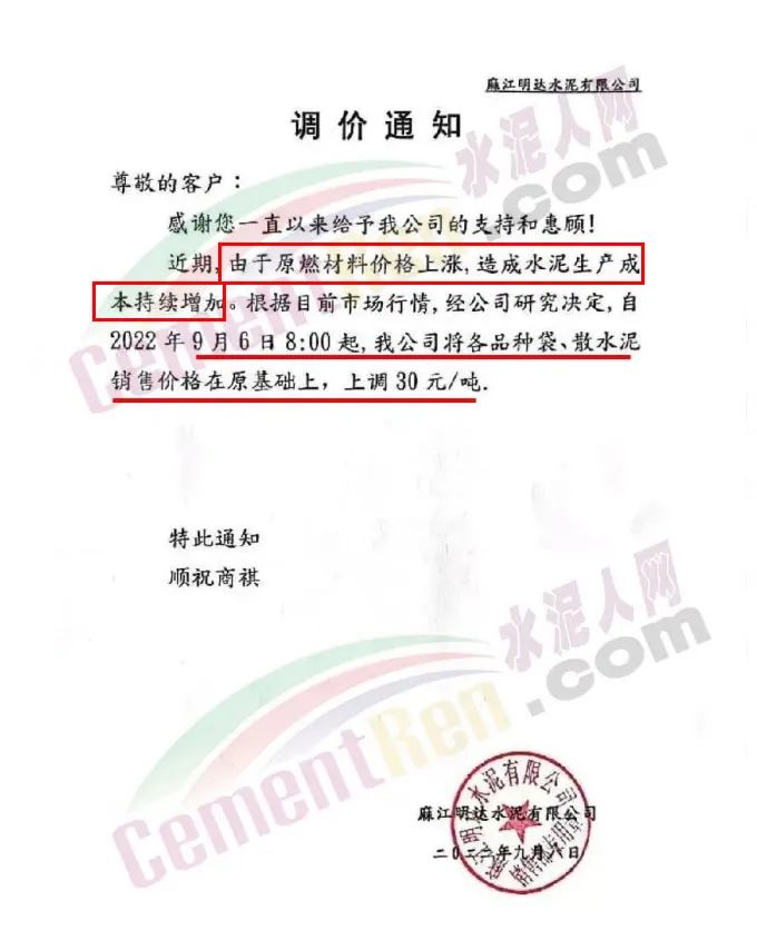 由于煤炭價格的不斷攀升,讓下游的水泥企業(yè)成本急劇上升,水泥企業(yè)也紛紛亮起漲價大旗,開始了漲價模式。企業(yè)漲價通知多稱因原燃材料價格上漲,成本增加。