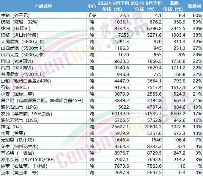 國家統(tǒng)計(jì)局近期公布的2022年8月下旬流通領(lǐng)域重要生產(chǎn)資料市場價格變動情況顯示,全國流通領(lǐng)域9大類50種重要生產(chǎn)資料市場價格的監(jiān)測顯示,2022年8月下旬與8月中旬相比,25種產(chǎn)品價格上漲。同比上年同期生豬、燒堿、柴油、紙漿、煤炭、汽油、豆粕、石蠟、復(fù)合肥、小麥等14種產(chǎn)品價格漲幅超過20%,其中生豬價格上漲了60%,柴油(0#國VI)上漲了39%,紙漿(進(jìn)口針葉漿)上漲38%,大同混煤(5800大卡)上漲了32%。