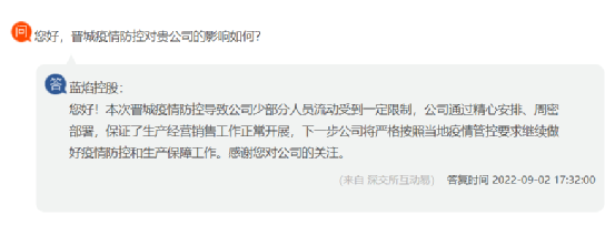 山西晉城藍(lán)焰控股回復(fù)本次晉城疫情防控導(dǎo)致公司少部分人員流動受到一定限制,公司通過精心安排、周密部署,保證了生產(chǎn)經(jīng)營銷售工作正常開展,下一步公司將嚴(yán)格按照當(dāng)?shù)匾咔楣芸匾罄^續(xù)做好疫情防控和生產(chǎn)保障工作。