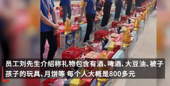 9月9日,江蘇徐州。一公司花費27萬左右給300名工人每人發(fā)放了30件中秋禮品。公司劉先生稱,每個人禮品價值大概是800多元,公司逢年過節(jié)就這樣,為此還遭到了同行的投訴。福利太好了,工人在公司的地位很重要,領(lǐng)導(dǎo)和工人都來自農(nóng)村,逢年過節(jié)送點福利,也是希望工人開心。