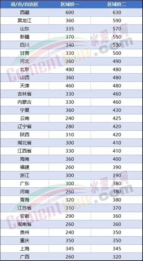 水泥人網(wǎng)信息中心數(shù)據(jù)顯示,目前市場(chǎng)較高價(jià)格仍在西藏、黑龍江、山東、四川、甘肅、河北、吉林等主要品牌企業(yè)占比權(quán)重相對(duì)較高的的區(qū)域。