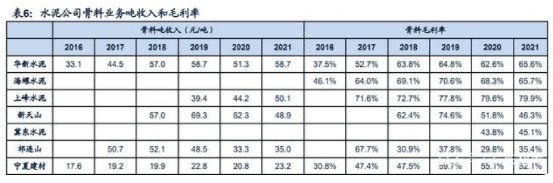 骨料資源屬性帶來高盈利壁壘,區(qū)域間有明顯分化。一方面,2016~2019年由于環(huán)保等因素關(guān)停大量小礦山,在淘汰落后產(chǎn)能的同時、新增產(chǎn)能補(bǔ)充不及時,礦山數(shù)量和砂石產(chǎn)量明顯減少,造成骨料供需短期失衡,價格大幅上漲。全國砂石骨料均價從2016年的46元/噸漲至2020年的100元/噸以上。海螺水泥骨料毛利率從2016年的46%升至2021年的68.34%;華新骨料業(yè)務(wù)毛利率從2016年的37.5%上漲至2021年的65.6%;上峰水泥2021年砂石骨料毛利率高達(dá)79.92%……