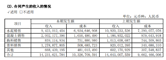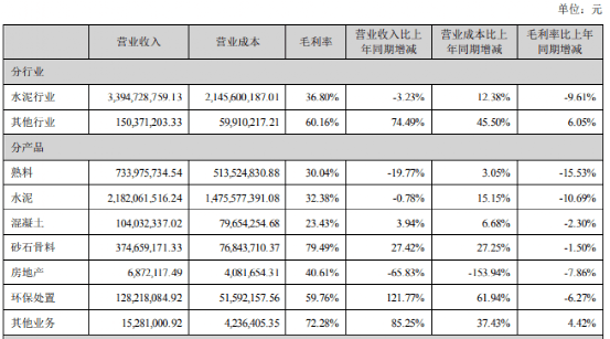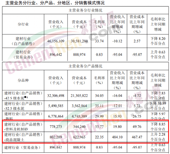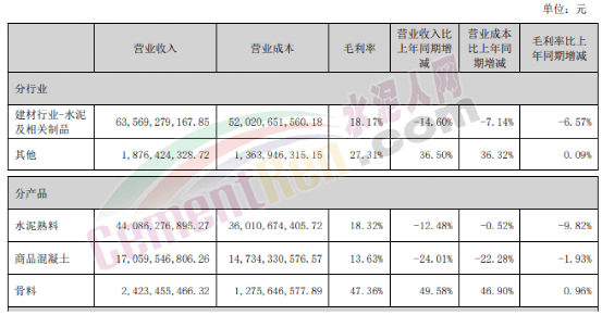 報告期內(nèi),42.5級水泥毛利率同比上升2.03個百分點,32.5級水泥毛利率同比下降1.84個百分點,熟料毛利率同比上升6.72個百分點;其中集團(tuán)自產(chǎn)品42.5級水泥毛利率、32.5級水泥毛利率、熟料毛利率同比分別下降7.83個百分點、10.89個百分點、5.97個百分點。骨料及機(jī)制砂綜合毛利率為55.77%,同比下降8.85個百分點;商品混凝土綜合毛利率22.35%,同比上升2.28個百分點。
