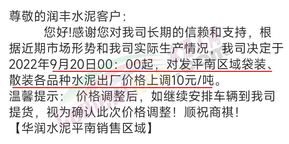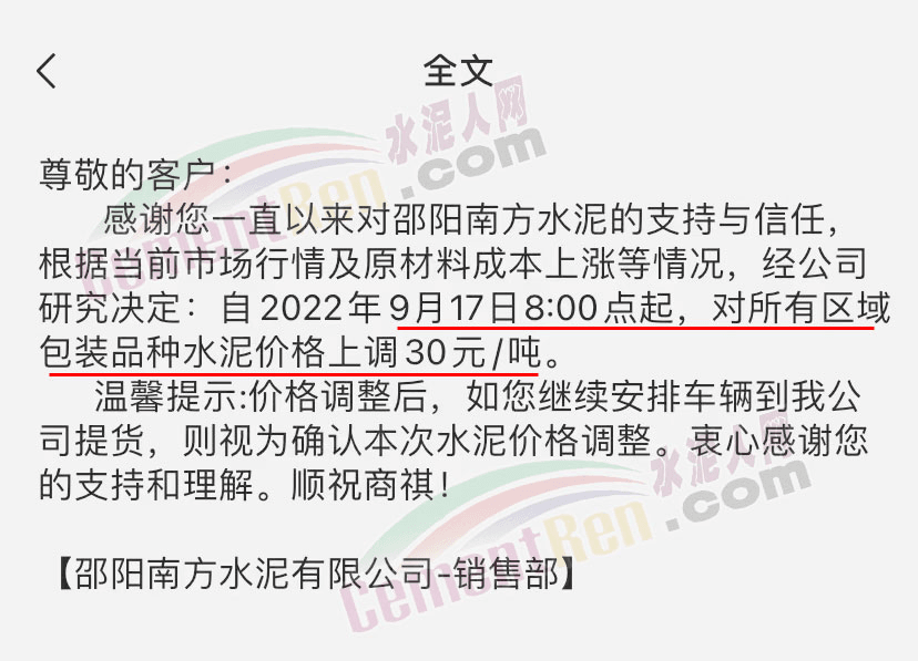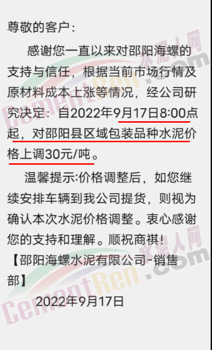 邵陽(yáng)南方水泥有限公司銷售部通知,自9月17日早8時(shí)起,對(duì)所有區(qū)域所有品種水泥價(jià)格上調(diào)30元/噸。