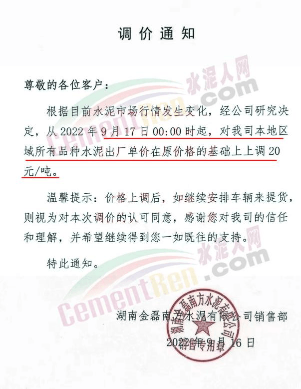 湖南金磊南方水泥有限公司銷售部通知,自9月17日0時(shí)起,對(duì)公司本地區(qū)域所有品種水泥出廠價(jià)上調(diào)20元/噸。