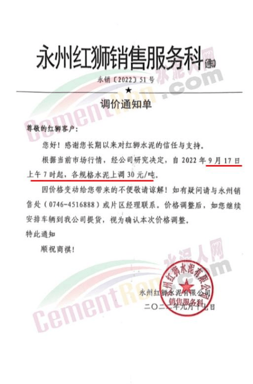 永州紅獅水泥有限公司通知,自9月17日上午7時(shí)起,各規(guī)格水泥上調(diào)30元/噸。