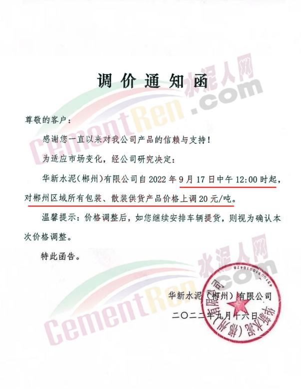 華新水泥(郴州)有限公司通知,自9月17日中午12時(shí)起對(duì)郴州區(qū)域所有包裝、散裝供貨產(chǎn)品價(jià)格上調(diào)20元/噸。