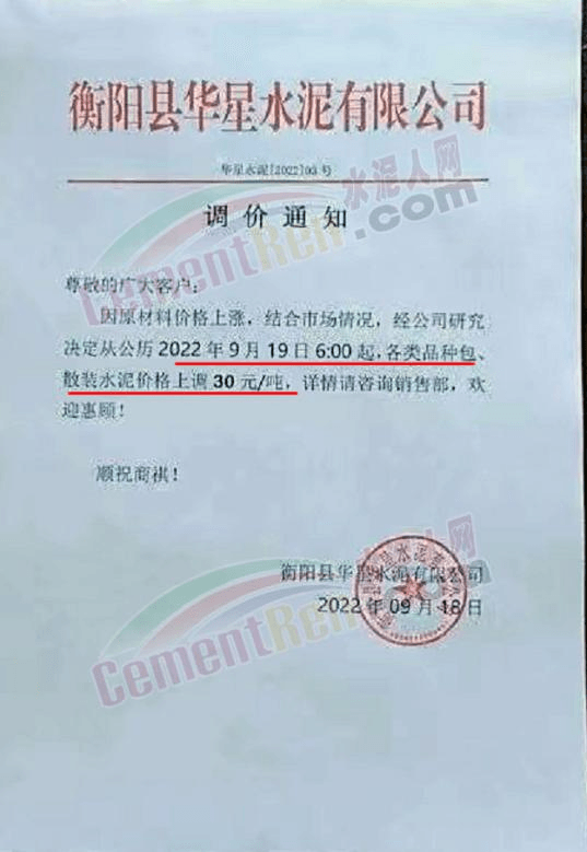 湖南衡陽(yáng)縣華星水泥有限公司通知,自9月19日6時(shí)起,各類品種包散裝水泥價(jià)格上調(diào)30元/噸。