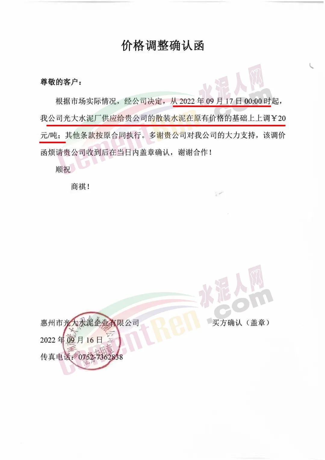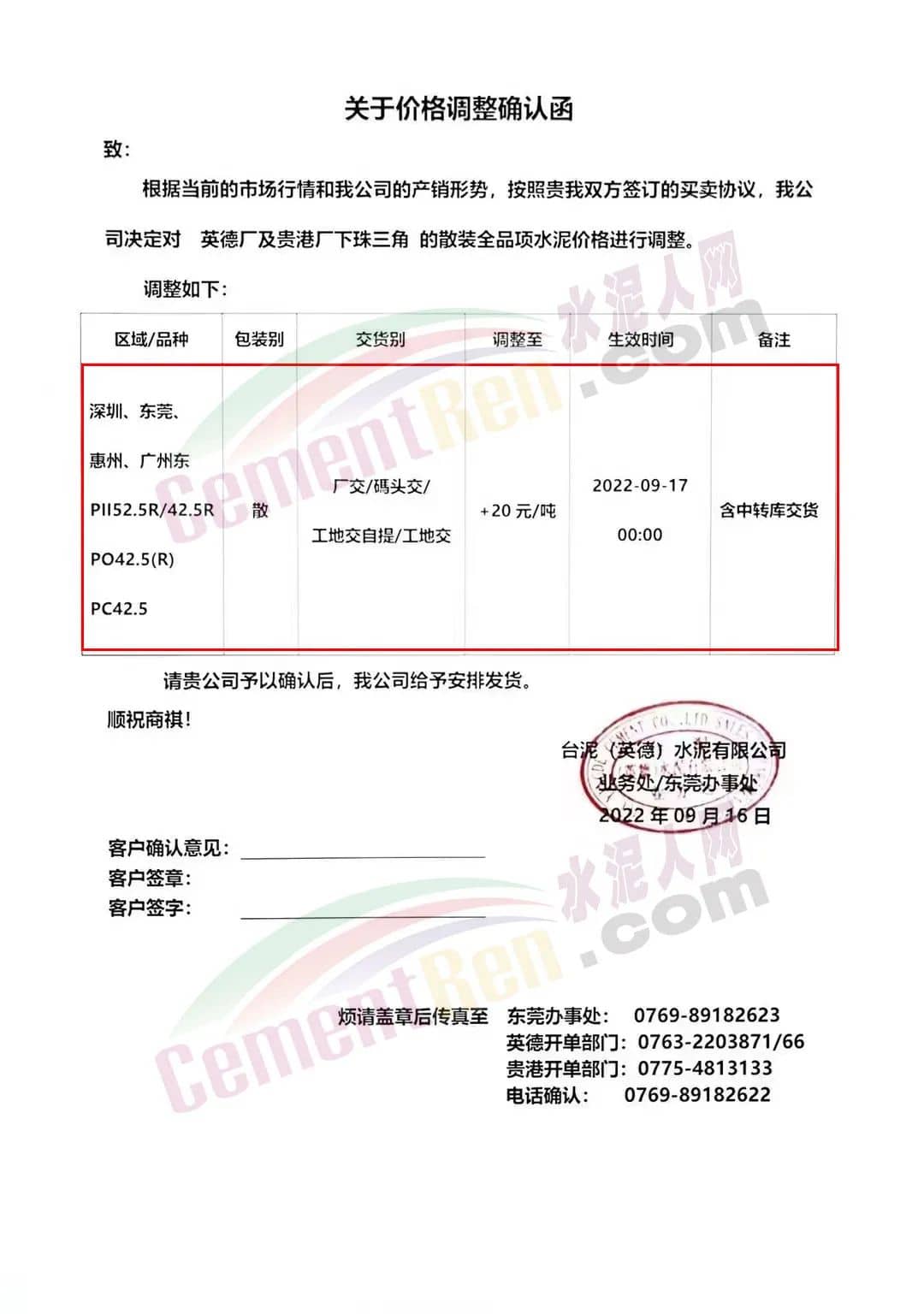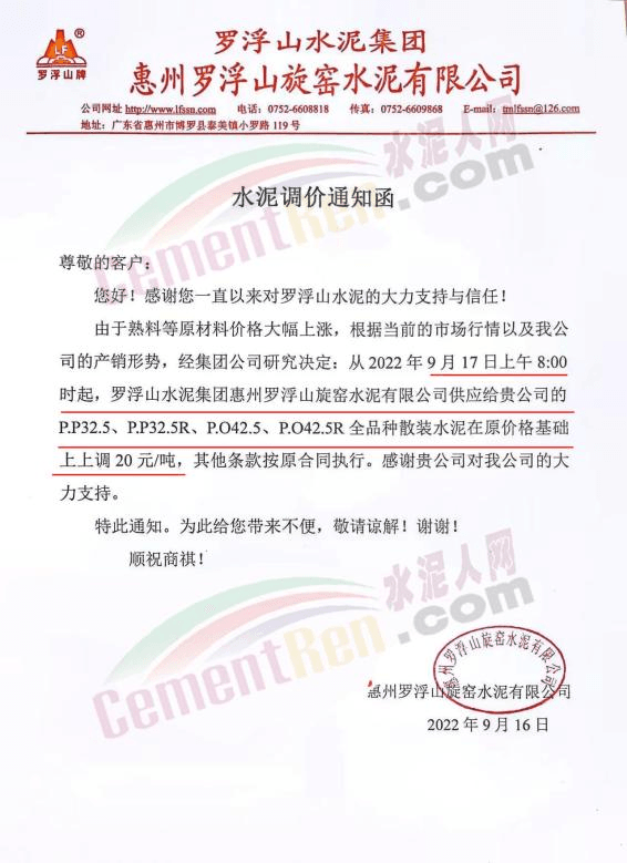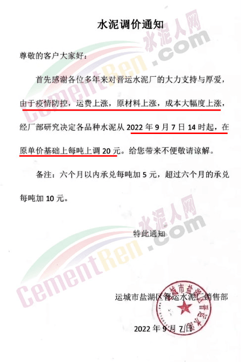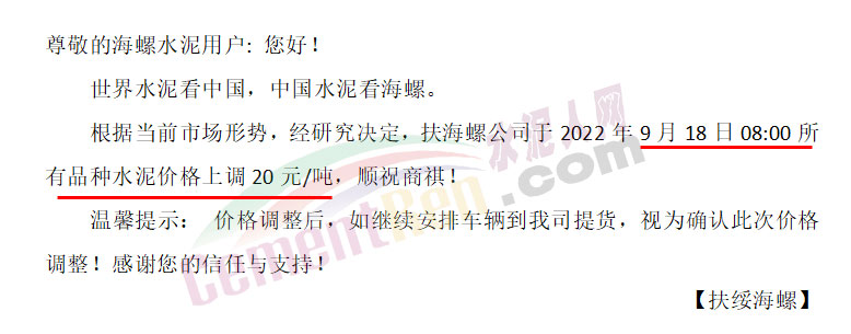 雙峰海螺水泥有限公司通知,根據(jù)當(dāng)前市場(chǎng)行情以及材料成本上漲等情況,經(jīng)公司研究決定,自2022年9月17日800起,對(duì)各品種水泥的掛牌出廠價(jià)格上調(diào)30元/噸。