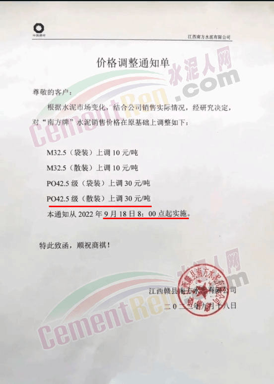 江西贛縣南方水泥有限公司通知自9月18號(hào)8點(diǎn)起南方32.5水泥上調(diào)10元/噸,42.5水泥上調(diào)30元/噸。