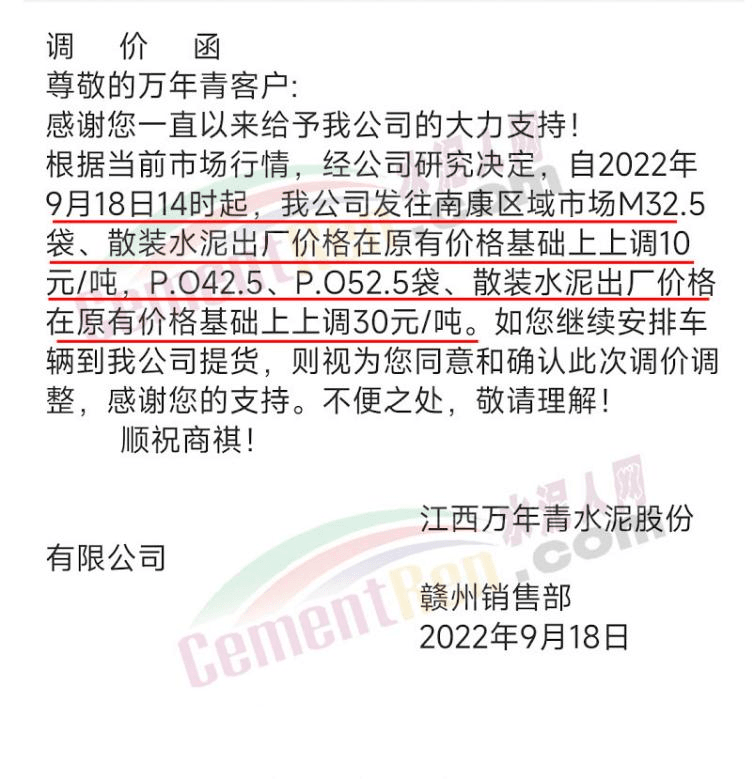 江西萬(wàn)年青水泥股份有限公司贛州銷售部通知根據(jù)當(dāng)前市場(chǎng)行情,經(jīng)公司研究決定,自9月18日14時(shí)起,公司發(fā)往南康區(qū)域市場(chǎng)M32.5 袋、散裝水泥出廠價(jià)格在原有價(jià)格基礎(chǔ)上上調(diào)10 元/噸,P.042.5、P.052.5袋、散裝水泥出廠價(jià)格在原有價(jià)格基礎(chǔ)上上調(diào)30元/噸。
