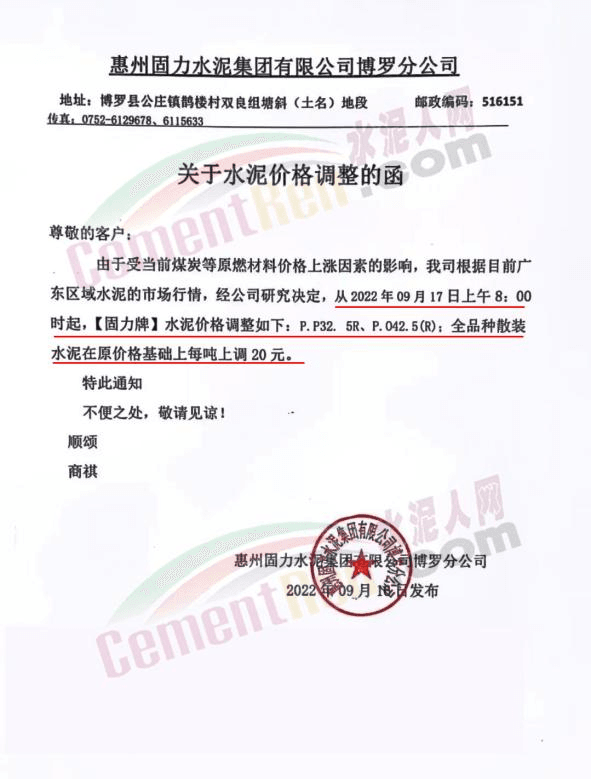 廣東華潤(rùn)、塔牌、臺(tái)泥、光大、羅浮山等企業(yè)調(diào)漲20元/噸