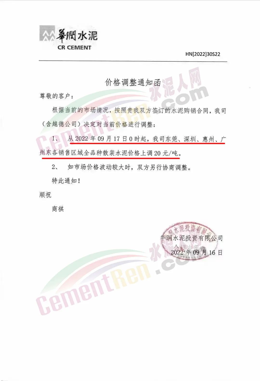 華潤(rùn)水泥旗下湖南良田水泥有限公司通知,9月18日0時(shí)起,公司全品種散裝、袋裝水泥價(jià)格上調(diào)20元/噸。