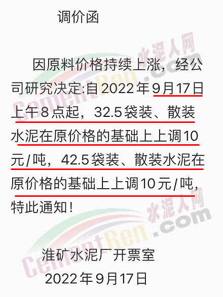 淮礦水泥廠開(kāi)票室通知,因原料價(jià)格持續(xù)上漲,經(jīng)公司研究決定∶自9月17日上午8點(diǎn)起,32.5袋裝、散裝水泥在原價(jià)格的基礎(chǔ)上上調(diào)10 元/噸,42.5袋裝、散裝水泥在原價(jià)格的基礎(chǔ)上上調(diào)10元/噸。