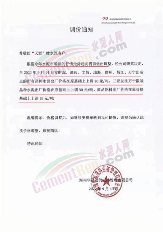 海南華昌茂供應(yīng)鏈管理有限公司、海南華裕茂供應(yīng)鏈管理有限公司通知,根據(jù)今年水泥市場(chǎng)新的行情走勢(shì)趨向提前做出調(diào)整,經(jīng)公司研究決定,自2022年9月14日零時(shí)起,澄邁、文昌、瓊海、儋州、昌江、萬(wàn)寧出貨點(diǎn)的所有品種水泥出廠價(jià)格在原基礎(chǔ)上上調(diào)30元/噸,三亞發(fā)往萬(wàn)寧散裝品種水泥出廠價(jià)格在原基礎(chǔ)上上調(diào)30元/噸。商品熟料出廠價(jià)格在原價(jià)格基礎(chǔ)上上調(diào)15元/噸。