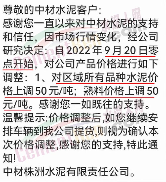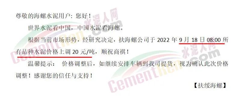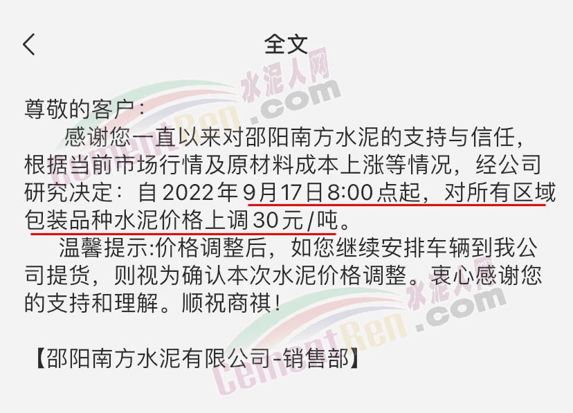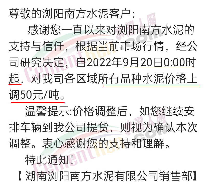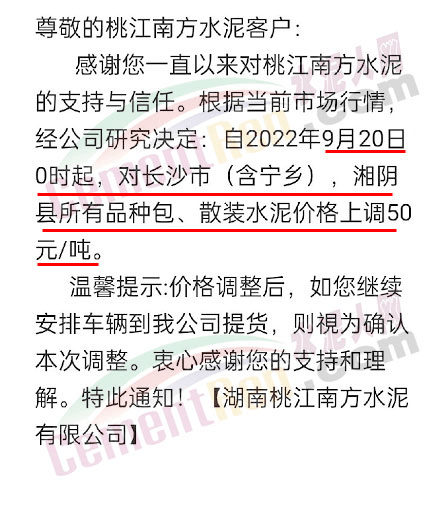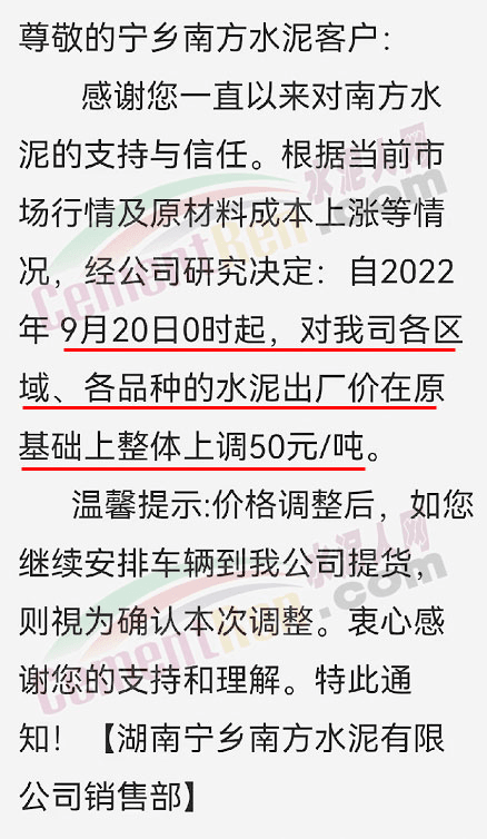 湖南寧鄉(xiāng)南方水泥有限公司銷售部通知根據(jù)當(dāng)前市場行情及原材料成本上漲等情況,經(jīng)公司研究決定自2022 年9月20日0時起,對各區(qū)域、各品種的水泥出廠價在原基礎(chǔ)上整體上調(diào)50元/噸。