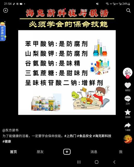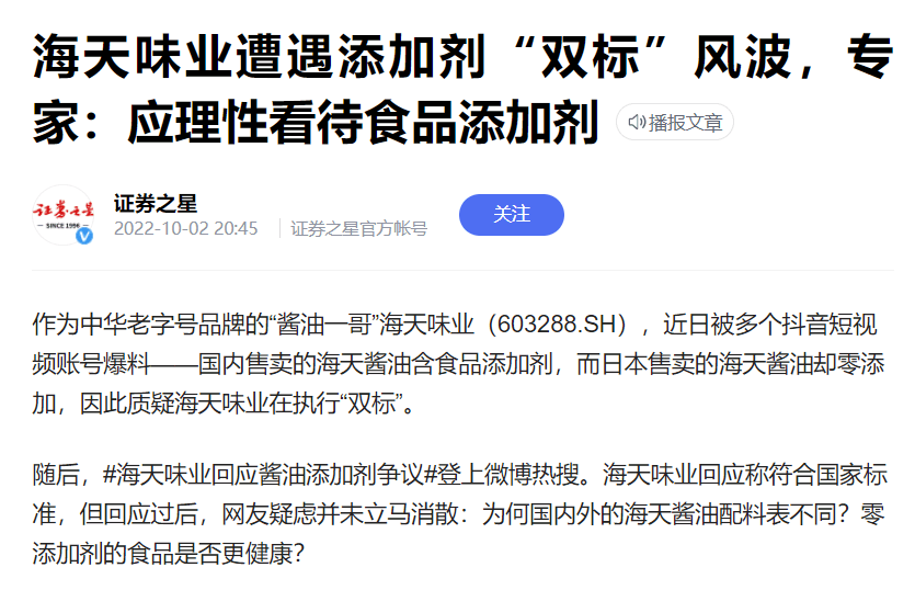 隨著“??怂箍萍?rdquo;視頻博主辛吉飛的持續(xù)爆料,越來越多的產(chǎn)品出現(xiàn)在觀眾眼前。辛吉飛拍了一個制作勾兌醬油的方法,雖然沒指名道姓,但大家還是聯(lián)想到了“醬油一哥”海天味業(yè)。此后,多個抖音短視頻賬號爆料——國內(nèi)售賣的海天醬油含食品添加劑,而日本售賣的海天醬油卻零添加,因此質(zhì)疑海天味業(yè)在執(zhí)行“雙標”。