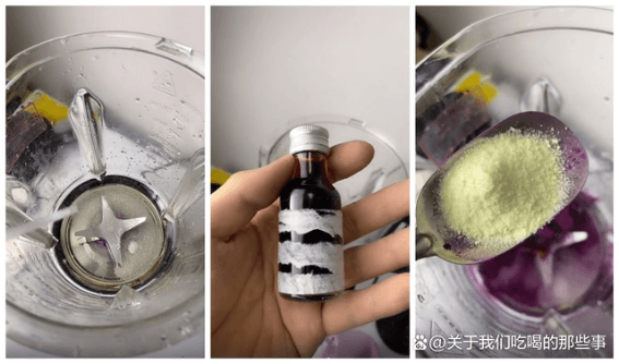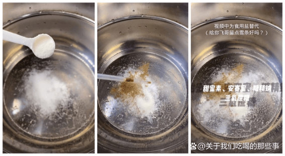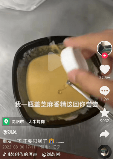 另一位“美食博主”劉慫也為大家?guī)砹?ldquo;科技食物”的詳細制作方法。普通的一勺花生醬,加點自來水,加點食用油,加點焦糖色素,加點芝麻香精后,一碗外面賣的芝麻醬就做好了。