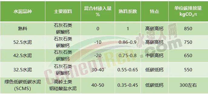 上述表格中列出的綠色低碳低鈣水泥,強度等級是32.5,特點是低碳低鈣低熟料系數(shù),國際上統(tǒng)稱為新型低碳膠凝材料Supplementary Cementitious Materials (SCMs),直譯為補充型水泥質材料。