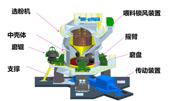 物料從下料口落在磨盤中央,在離心力的作用下,物料從磨盤中央向磨盤邊緣移動(dòng),經(jīng)過(guò)磨盤的磨損區(qū)域時(shí),受到磨輥的碾壓而粉碎,被粉碎的物料繼續(xù)向磨盤邊緣移動(dòng),合格的物料將會(huì)被設(shè)備的集塵器收集。