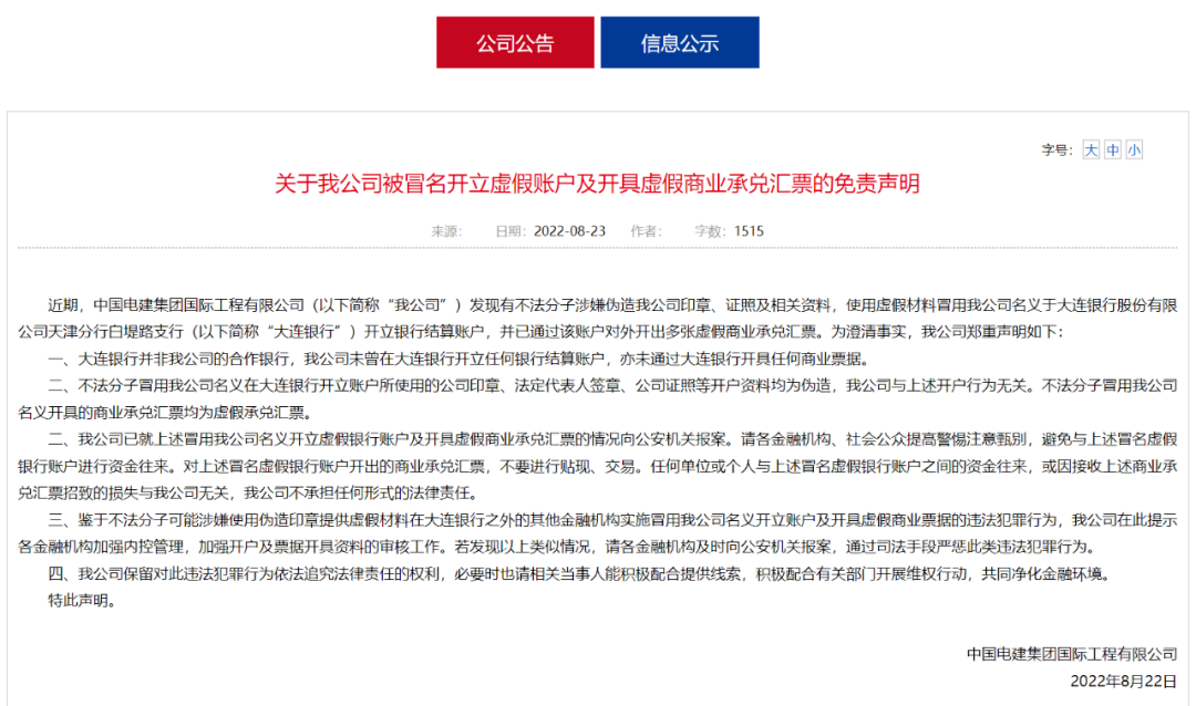 前不久,中國電建集團國際工程有限公司發(fā)布《關于我公司被冒名開立虛假賬戶及開具虛假商業(yè)承兌匯票的免責聲明》稱:發(fā)現(xiàn)有不法分子涉嫌偽造公司印章、證照及相關資料,使用虛假材料冒用公司名義于銀行開立結算賬戶,并已通過該賬戶對外開出多張?zhí)摷偕虡I(yè)承兌匯票。