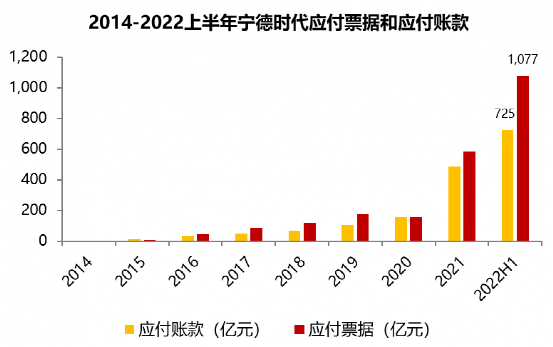 面對營業(yè)成本的快速上升和不斷擴大的產(chǎn)能,寧德時代資金支付需求快速上升。企業(yè)對供應商的欠款一般在資產(chǎn)負債表中計入應付賬款和應付票據(jù)項目中,寧德時代2012-2022上半年應付賬款和應付票據(jù)變化情況如下: