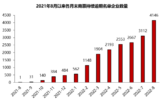 據(jù)上海票交所公開數(shù)據(jù), 2022年3月1日至2022年8月31日出現(xiàn)3次以上付款逾期,且截至2022年8月31日有逾期余額或2022年8月當月出現(xiàn)付款逾期的承兌人數(shù)量為4146家,較上月末增加1034家,創(chuàng)歷史新高。其中房地產(chǎn)相關企業(yè)依然是商票逾期的重災區(qū),4146家逾期企業(yè)中,房地產(chǎn)、建筑、租賃和商務服務企業(yè)達到3265家,占比79%;首次逾期的1247家企業(yè)中,房地產(chǎn)、建筑企業(yè)、租賃和商務服務企業(yè)達到997家,占比80%。廣州富力地產(chǎn)股份有限公司首次出現(xiàn)在逾期名單之上,8月末逾期余額3575萬元,房地產(chǎn)企業(yè)風險仍在持續(xù)暴露。
