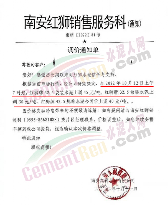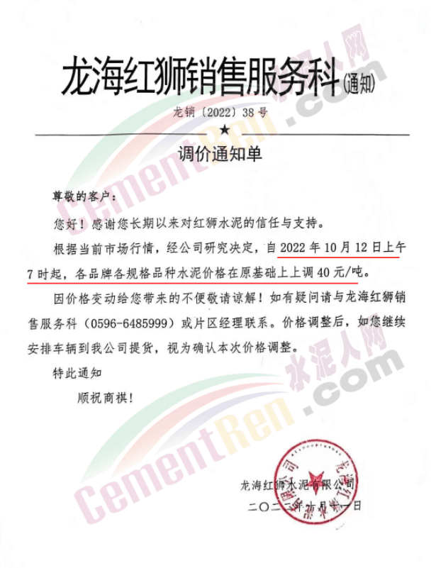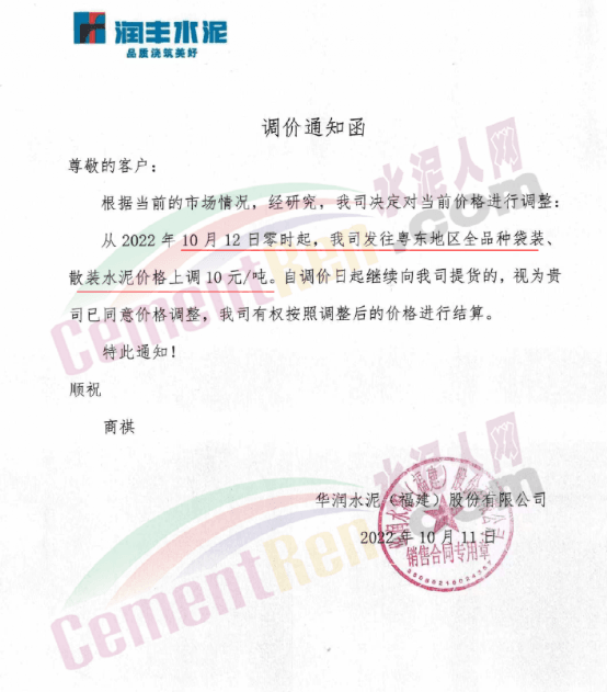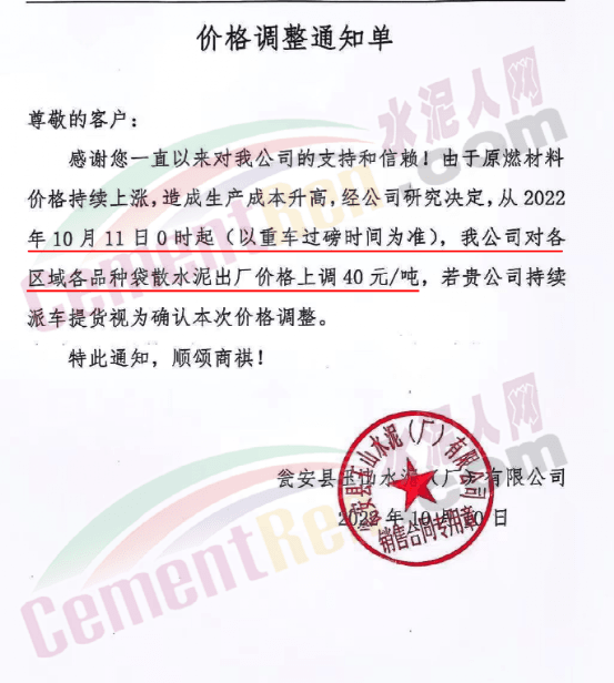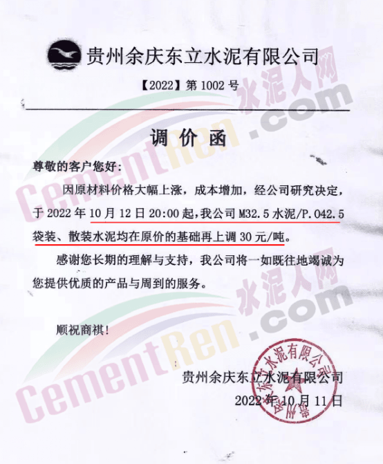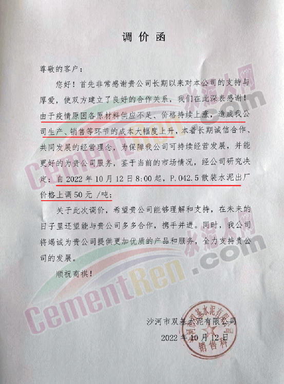 日前,沙河市雙基水泥有限公司通知,由于疫情原因各原材料供應(yīng)不足、價格持續(xù)上漲,造我公司生產(chǎn)、銷售等環(huán)節(jié)的成本大幅度上升,本著長期誠信合作、共同發(fā)展的經(jīng)營理念,為保障務(wù),鑒于當前的市場情況,經(jīng)公司研究決定自2022年10月12日8時起,P.042.5散裝水泥出廠價格上調(diào)50元/噸。