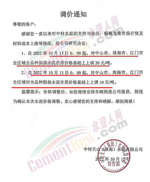 廣東中材天山(珠海)水泥有限公司通知,10月13日起上調(diào)中山、珠海、江門區(qū)域水泥價格10-20元/噸。