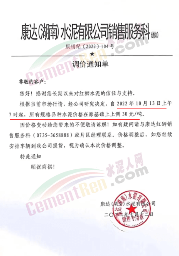 紅獅水泥旗下康達湖南水泥有限公司通知自13日上午7時起,所有規(guī)格品種水泥上調(diào)30元/噸。
