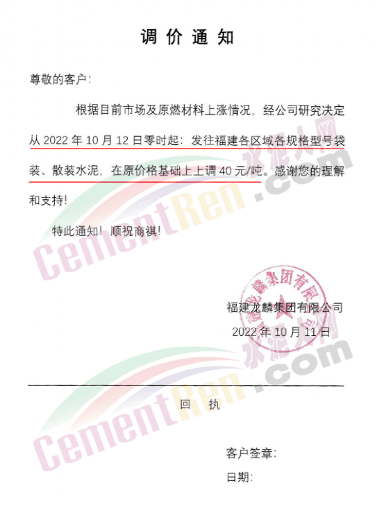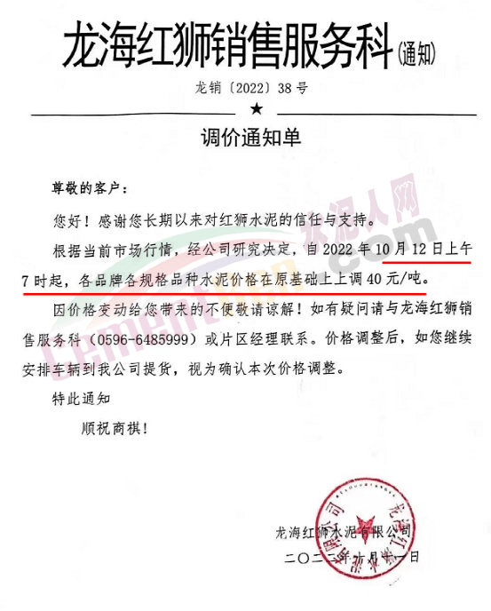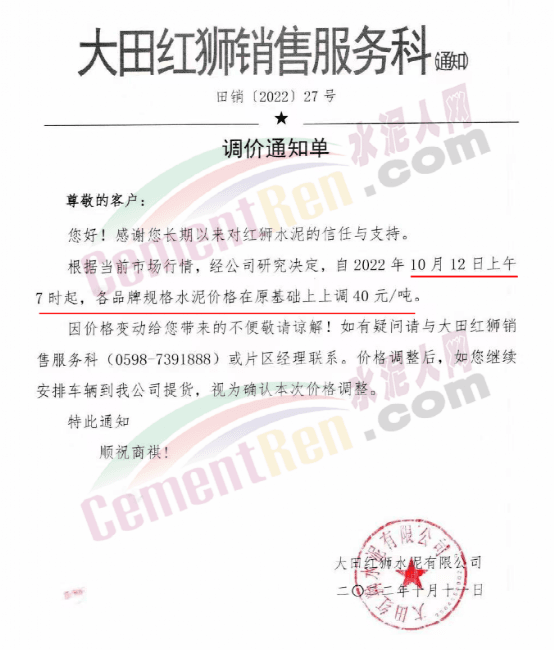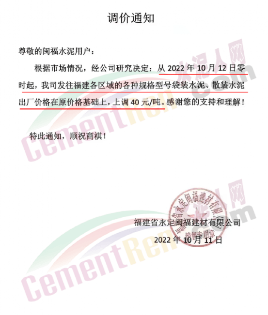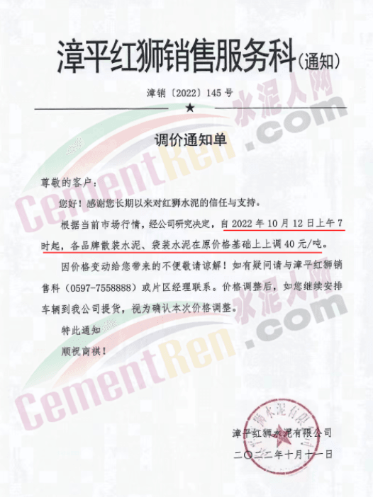 福建區(qū)域華潤水泥、福建水泥、紅獅水泥等多家主要品牌企業(yè)上調(diào)福建及粵東區(qū)域水泥價格40元/噸。
