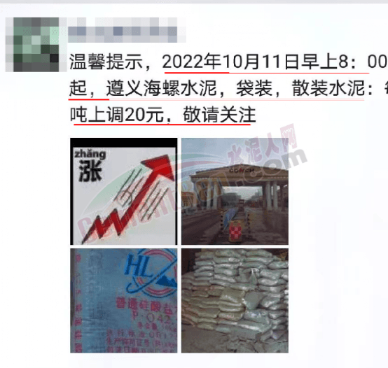 遵義海螺通知,自11日起上調(diào)20元/噸。