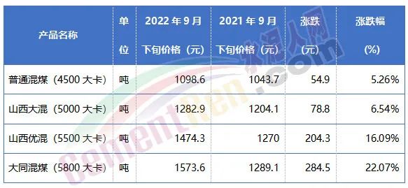 國家統(tǒng)計局發(fā)布的9月下旬流通領(lǐng)域煤炭價格顯示,2022年9月下旬各規(guī)格煤價較上年同期均有上漲。其中5800大卡大同混煤報價1573.6元/噸,較上年同期上漲了284.5元/噸,漲幅22.07%。