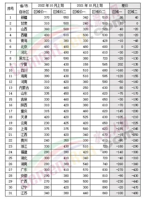 水泥人網(wǎng)信息中心重點監(jiān)管控的31個省市地區(qū)企業(yè)報價可見,2022年10月上旬較上年同期漲跌趨勢可見,同比上年同期江蘇、遼寧、廣西、安徽、廣東等區(qū)域水泥價格最高跌價都超過了400元/噸,江蘇區(qū)域同比跌價近500元/噸。跌幅的進一步擴大,也從另一側(cè)面說明水泥價格尚有較大上調(diào)空間。