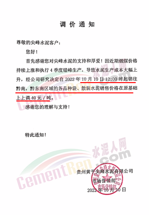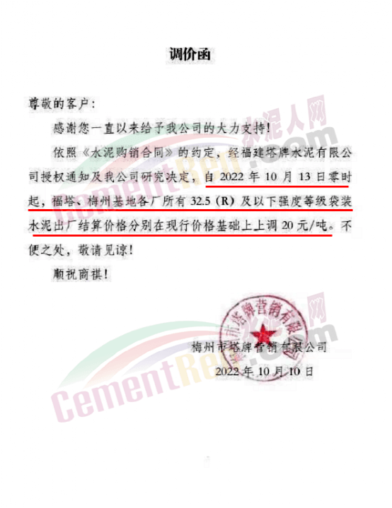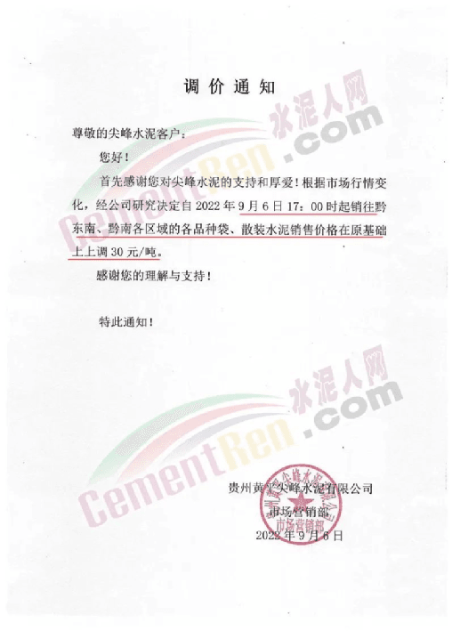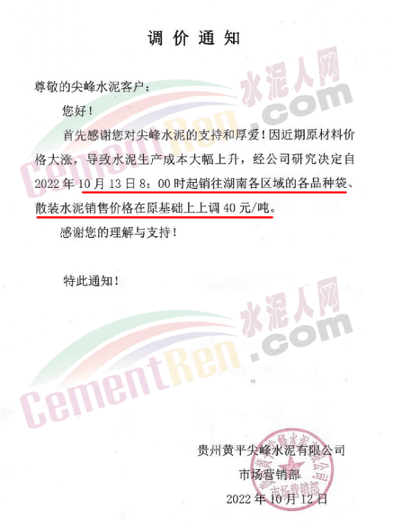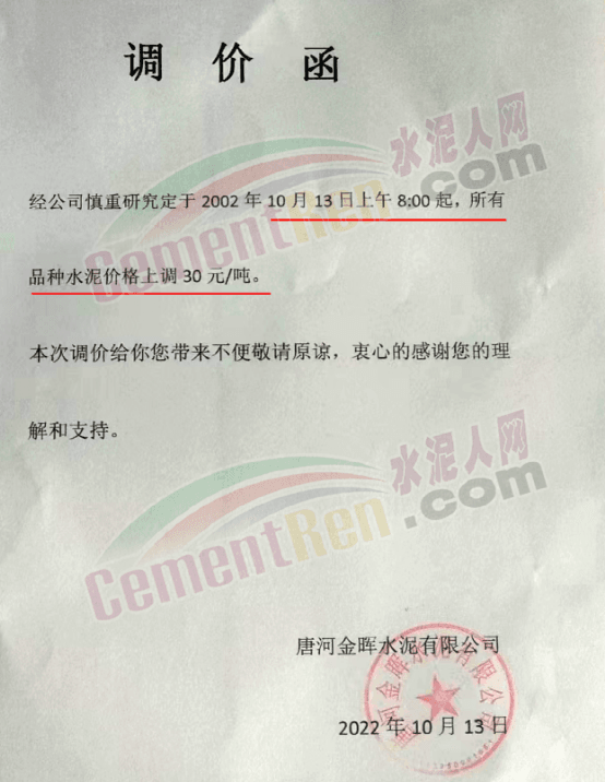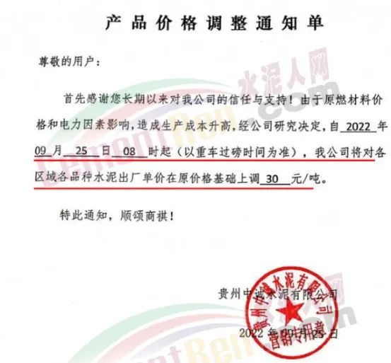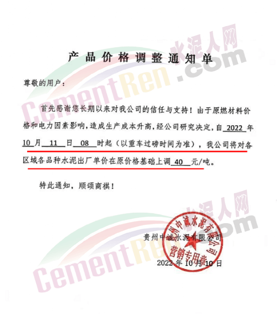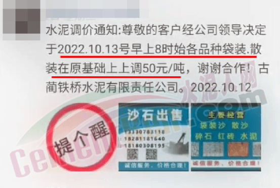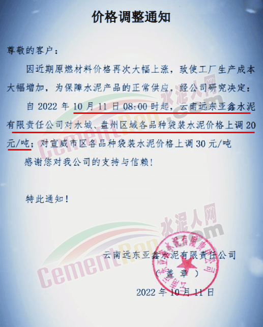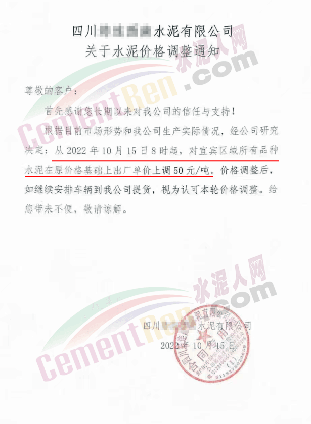 日前,四川某水泥企業(yè)通知自10月15日8時(shí)起,對宜區(qū)域所有品種水泥價(jià)格上調(diào)50元/噸,價(jià)格調(diào)整后,如繼續(xù)安排車輛到公司提供,則視為認(rèn)可本輪價(jià)格調(diào)整。
