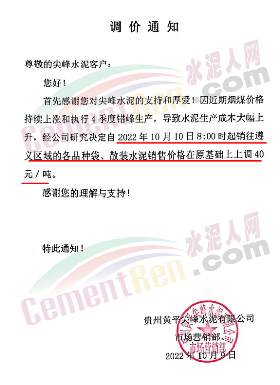 貴州黃平尖峰分別于10月10日和13日通知上調(diào)貴州黔南、黔東南、遵義以及湖南區(qū)域水泥價(jià)格40元/噸。9月初企業(yè)還曾針對貴州區(qū)域市場上調(diào)30元/噸,兩次累計(jì)上調(diào)60-70元/噸。