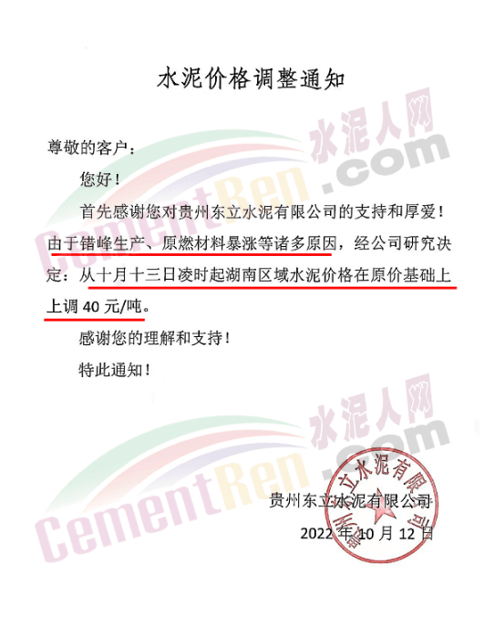 貴州余慶東立水泥分別于9月7日、10月12日通知上調(diào)水漲價(jià)格30元/噸,兩次累計(jì)上調(diào)60元/噸。