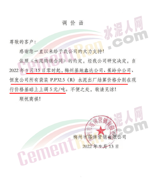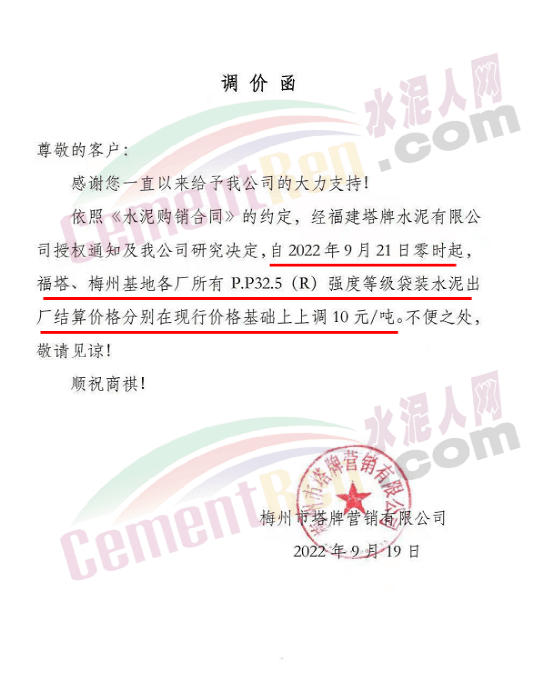 廣東梅州市塔牌營銷有限公司分別于9月15日、9月21日、10月13日上調(diào)袋裝P.P32.5(R)水泥出廠價(jià)5元/噸、10元/噸、20元/噸,三次累計(jì)上調(diào)35元/噸。
