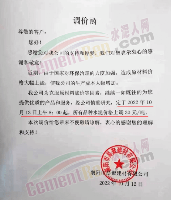 襄陽市易聚建材有限公司通知,為克服原材料漲價(jià)等因素,定于10月13日上午8時(shí)上午8時(shí)所有品種水泥上調(diào)30元/噸。