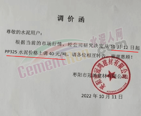 棗陽市冠鴻建材有限公司通知10月12日起PP32.5水泥上調(diào)40元/噸。