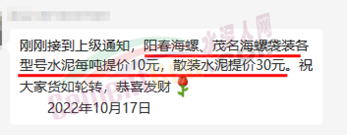 同日,廣東區(qū)域經(jīng)銷商通知,陽春海螺、茂名海螺袋裝各型號(hào)水泥報(bào)價(jià)上調(diào)10元/噸,散裝水泥上調(diào)30元/噸。