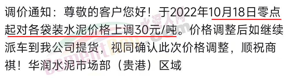 華潤水泥市場部(貴港)區(qū)域通知10月18日零點(diǎn)起對袋裝水泥價(jià)格上調(diào)30元/噸。