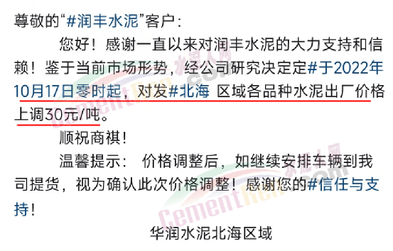 華潤水泥北海區(qū)域通知10月17日零時(shí)起,對發(fā)北海區(qū)域各品種水泥出廠價(jià)格上調(diào)30元/噸。