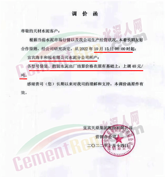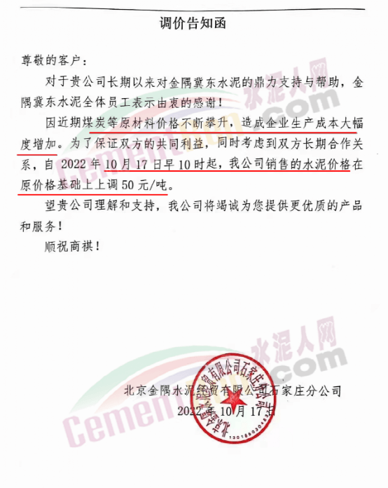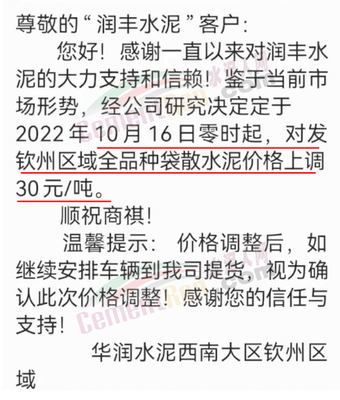 水泥人網(wǎng)通訊員消息:10月17日,甘肅酒泉敦煌榮興建材有限責(zé)任公司通知,由于近期疫情原因,工廠原輔材料市場行情波動(dòng)較大,原燃材料價(jià)格及運(yùn)費(fèi)整體上漲,導(dǎo)致生產(chǎn)成本大幅上升且供應(yīng)無法保證,現(xiàn)經(jīng)公司領(lǐng)導(dǎo)研究決定,自2022年10月18日零點(diǎn)零時(shí)起,公司將對所有品種袋、散水泥價(jià)格在現(xiàn)執(zhí)行價(jià)格的基礎(chǔ)上上調(diào)30元/噸(含預(yù)付款)。