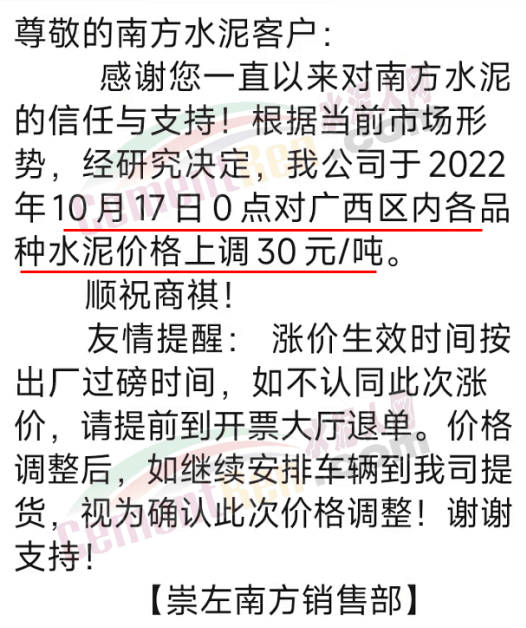 崇左南方銷售部通知,根據(jù)當(dāng)前市場形勢,經(jīng)研究決定公司于10月17日0點(diǎn)對廣西區(qū)域各品種水泥價(jià)格上調(diào)30元/噸。